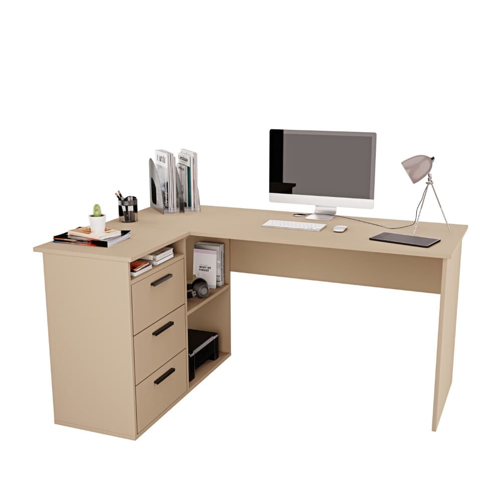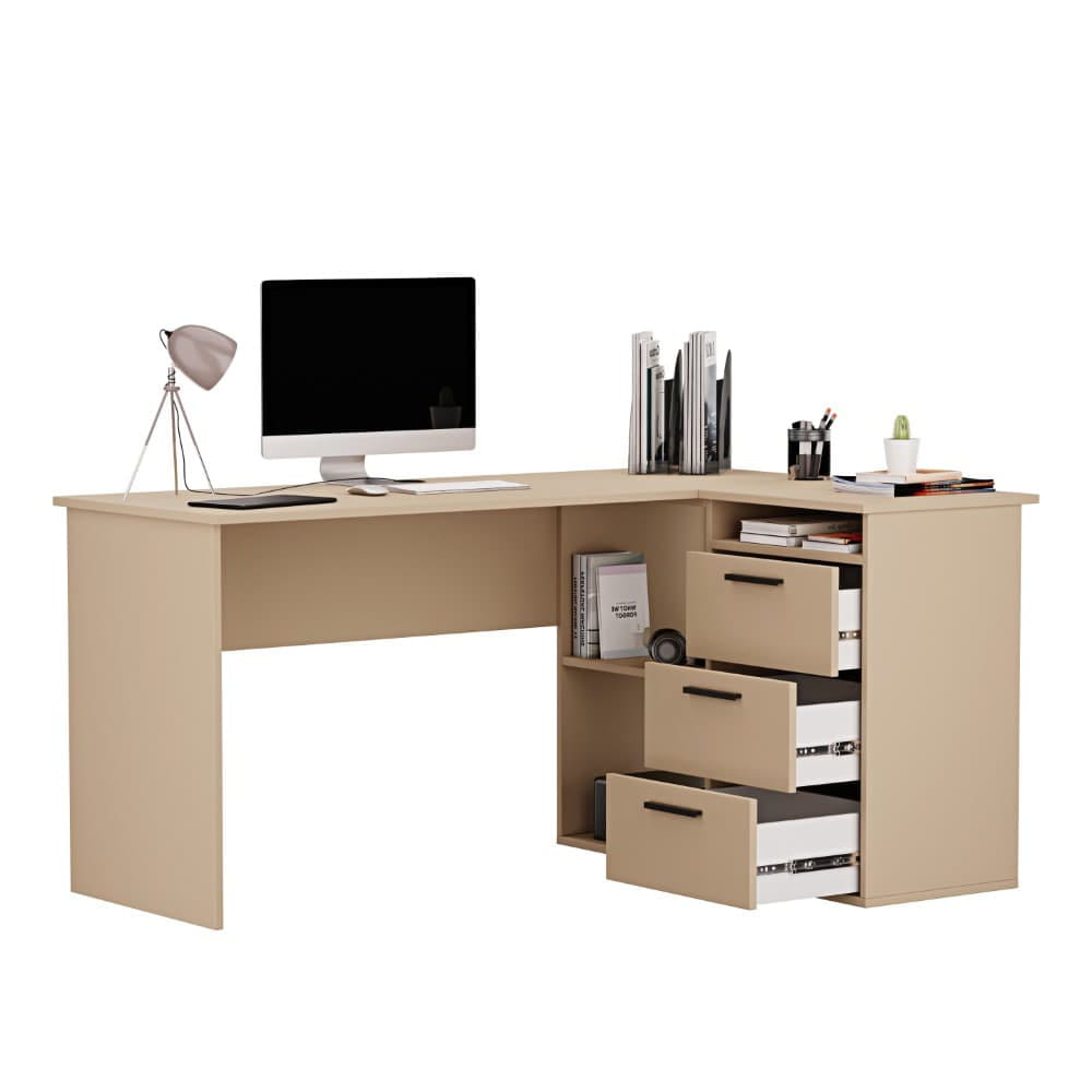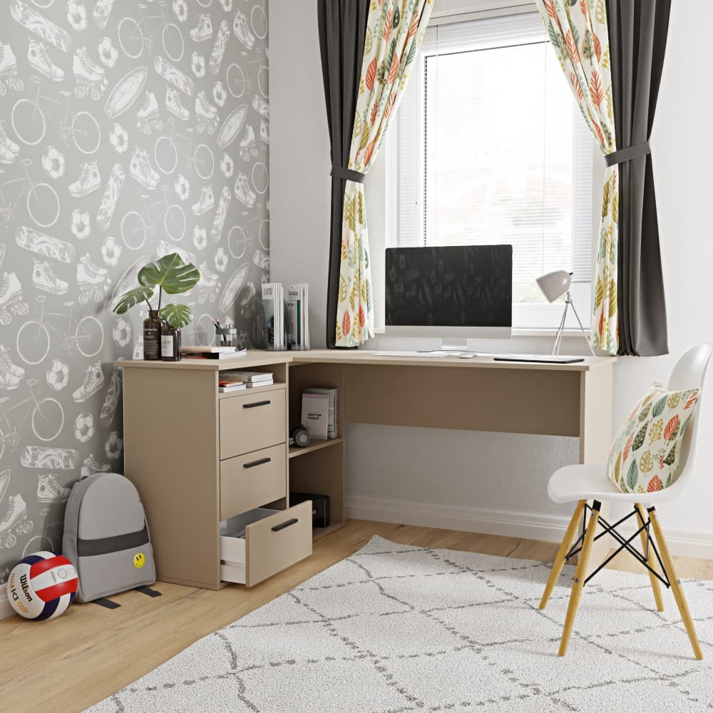 Biroul Aga depășește standardele datorită construcției sale inovatoare în forma literei L. Această formă nu doar utilizează eficient spațiul colțar, dar facilitează și organizarea muncii pe multiple dispozitive. Cele trei sertare adânci, combinate cu trei rafturi deschise, oferă un spațiu generos de stocare, ajutând la menținerea ordinii și organizării. Un avantaj suplimentar este portul pentru cabluri, care permite menținerea esteticii și ordinii pe suprafața biroului.