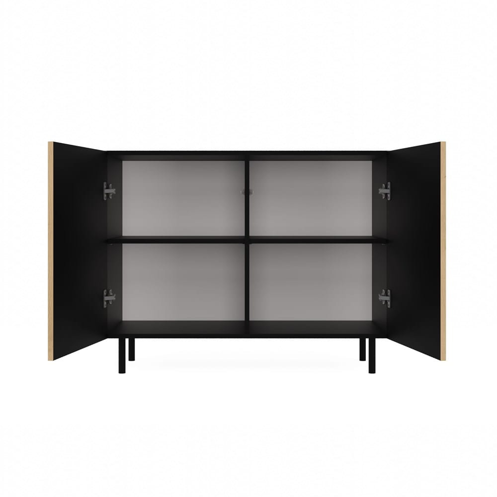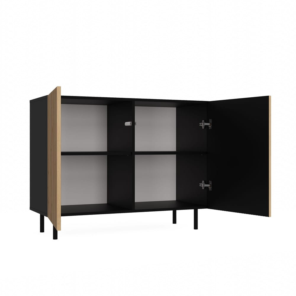 Un mare avantaj îl reprezintă picioarele rotunde din metal, cu o înălțime de 13 cm, care conferă ușurință întregii structuri și asigură stabilitatea comodei. Interiorul comodei este format din rafturi, care facilitează aranjarea obiectelor depozitate. Datorită lor, va fi mai ușor să găsiți ceea ce căutați. Comoda Modern are, de asemenea, fațadele ușilor fără mânere, care asigură confortul utilizării și subliniază caracterul modern al interiorului.